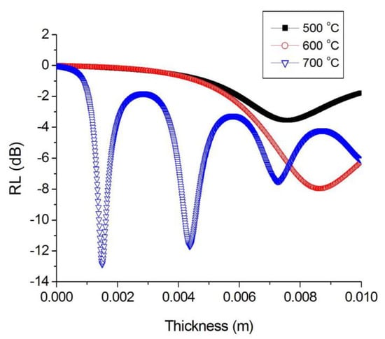 Based on the results, it follows that for samples obtained at 500 and 700 °C, the calculated optimal thickness based on the maximum of the imaginary part of the magnetic permeability is more than 8 mm, which is technologically impractical. However, for the FeCoCr/C 700 °C nanocomposite, several minima are observed including 1.5 mm, 4.3 mm, and 7.3 mm.