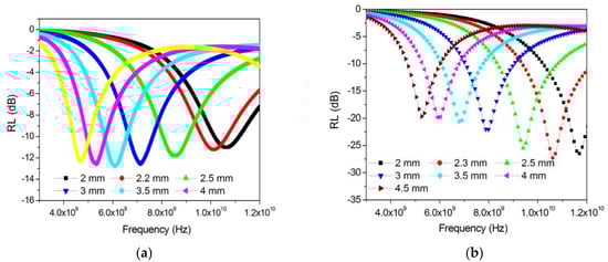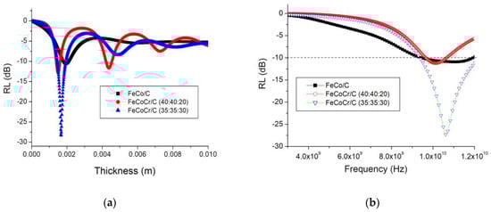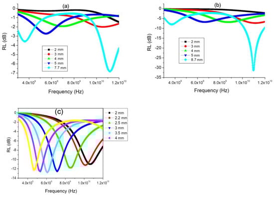 The calculations of the optimal thickness of the absorber layer based on the polymer nanocomposites FeCoCr/C with various compositions (Figure 12) showed that with an increase in the chromium proportion in the nanocomposite from 40-40-20 to 35-35-30, the minimum reflection corresponds to a greater thickness of the material, while the RL value reaches −27 dB. Compared with the nanocomposite FeCo/C, the required thickness is less, while the RL for FeCoCr/C nanocomposites (35:35:30) is significantly lower.