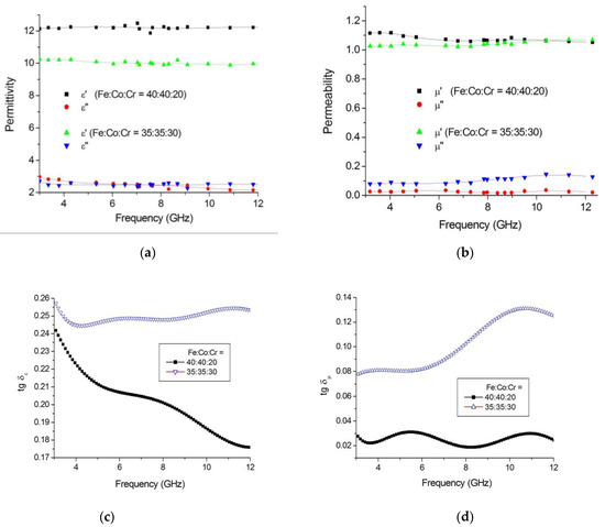 The effect of the ratio of metals in the precursor of pyrolyzed polyacrylonitrile on the electromagnetic and radio-absorbing properties of FeCoCr/C nanocomposites was considered. The measurement results for the complex dielectric and magnetic permittivity are shown in Figure 11.