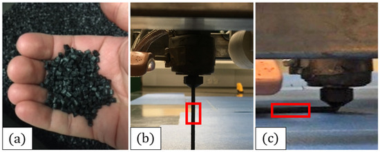 Three states of printed material: (a) a preprocessed pellet, (b) extrudate, and (c) a deposited bead.