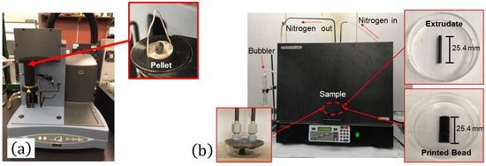 To decrease the effect of cut fibers on skewing the fiber length distribution of the extrudate and printed specimens, 25.4 mm specimens were used since they were relatively large compared to the nominal length of a fiber, 100∼500 μm. These specimens were too large to fit in the TGA machine though, so a Ney Vulcan 3-1750 box furnace (Scotia, NY, USA) was used as shown in Figure 4b. The specimens were enclosed in a Petri dish with an aluminum lid. Two pipes attached to the aluminum lid purged the enclosure with nitrogen. A similar burn-off procedure as for the pellet was repeated for the extrudate and printed specimens.