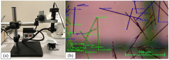 (a) An MZ7 microscope, used to capture micrographs of the fibers in a Petri dish. (b) Fibers being measured in a stitched micrograph. Green graph paper was placed under the Petri dish to provide a helpful frame of reference. The measurements in blue were measured in a current session, whereas the green measurements were from a previous measurement session.