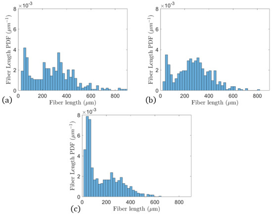 The fourth step was to plot the probability distribution function (PDF) of the fiber length and calculate other quantities of interest. Figure 6 shows the PDF of the fiber length, with the PDF being cast in units of μm for the three manufacturing stages. From the data in Figure 6, the number- and weight-average fiber lengths were calculated, respectively, by