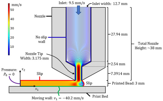 The flow domain in the present study is depicted in Figure 9 with the dimensions selected based upon the nozzle shown in Figure 2. Solutions for the Navier–Stokes equations were performed using COMSOL Multiphysics. The interior walls of the nozzle were assumed to be no-slip boundary conditions along with the surface of the print bed, whereas the surfaces of the melt flow that are outside of the confined nozzle were considered to have slip boundary conditions. The geometry of the flow domain at the leading edge of the flow was constructed such that the surface was stress-free, and the normal component of the velocity was also zero using the approach from Heller et al. [29] to identify the surface using an iterative approach. Once the velocity field was obtained from the finite element simulation, the spatially varying fiber orientation state, , was obtained using Equation (7) with , , and λ cast as a function of of the 3D-printed bead as given in Table 1. The fiber equations of motion were solved numerically using a custom program created in the MATLAB environment written by the authors. Then, using the material properties for the fiber and the matrix listed in Table 4, Equation (20) was evaluated across the flow domain using a custom script created by the authors that took the spatial location and returned the failure parameter at the specified location.