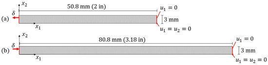 The orientation state at the end of the flow domain, , shown at the origin on the bottom left of Figure 9, was taken as the steady-state orientation and was used for all structural simulations. This orientation state was then projected along the direction of printing to form a specimen with an orientation that changed along but was constant along . The tensile and compression specimen model domains are shown in Figure 10. Each domain is of a single deposited bead. The bead subjected to tension or compression is allowed to freely slide in the vertical direction, except in the lower, right corner. That is, the displacement is zero in the lower, right corner and unconstrained everywhere else. The right edge of the bead is fixed horizontally, i.e., , and equal to some static displacement value in the direction, δ, on the left edge.