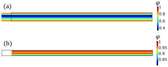 For the applied displacement δ, the spatially varying strain, ϵ(x), was computed from the finite element results along with the surface stresses. The effective stiffness values for tension or compression, and , respectively, were obtained by taking the average of the stress divided by the applied strain on the right end of the loaded specimen. Then, using the spatially varying strain values along with Equation (20), the spatially varying value for was obtained at every point in the solution domain. If the maximum value for was less than one, then the applied displacement δ was increased, whereas if at any point in the domain was more than one, the applied load was decreased. This process continued until the maximum spatial value for φ was one, thus suggesting that the member was at the onset of failure. At this point, and were calculated. A representative solution is shown in Figure 11a,b for a displacement resulting in a tensile and compression failure, respectively.