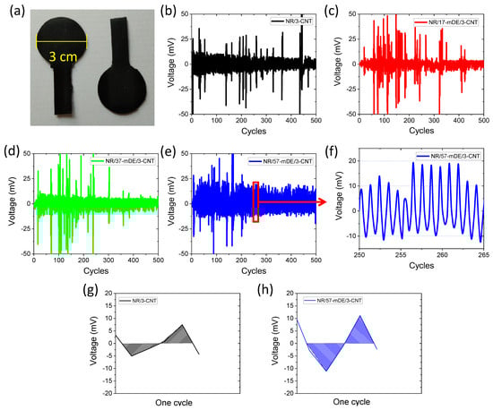 3.3. Electrical and Energy Harvesting Performances of the Rubber Composites
