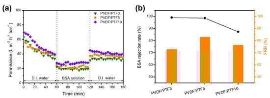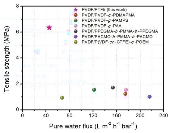 | PVDF/PTF5 | 45.4 | 98.6 | 6.34 | 47.8 | Cross-flow | This work |