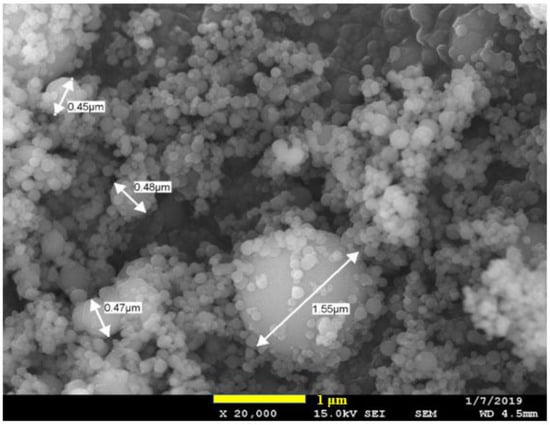 SEM image indicates most particles in the powder are nano-spherical, but they appear to form clusters.