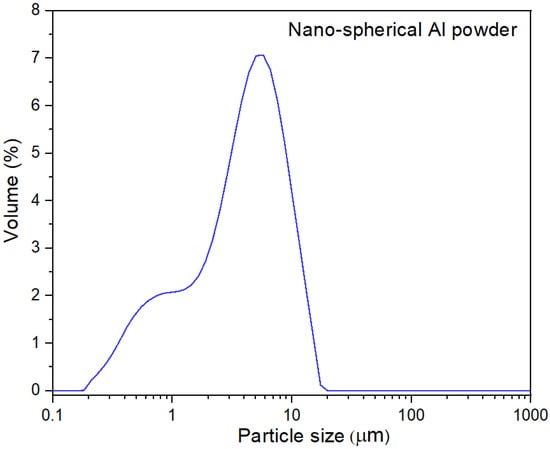 The size distribution of the aluminum powder particles was analyzed utilizing a Malvern Mastersizer 2000 (Malvern Ltd., Malvern, Worcestershire, UK). This instrument utilizes light scattering to measure the volume-based particle size distribution.