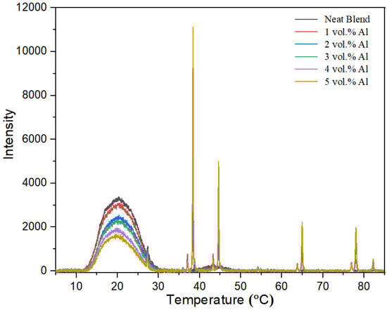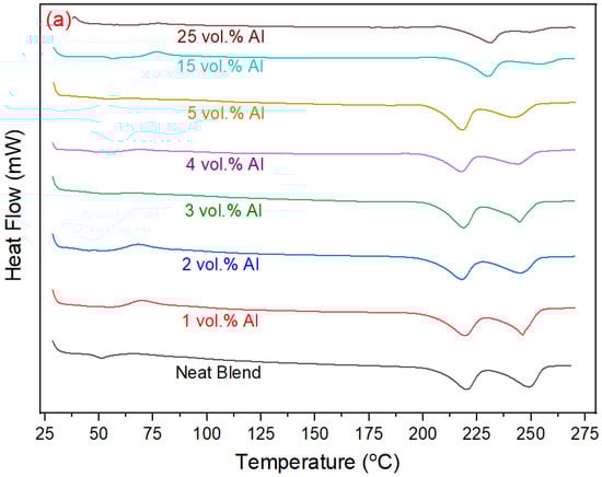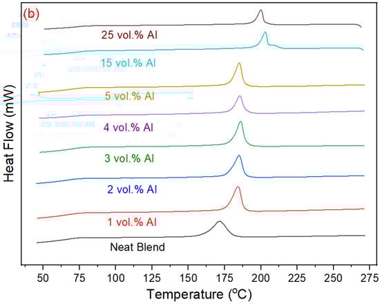 Only a single melt crystallization peak was observed in the cooling curves of Figure 6b for the PBT–PET blend as well as the Al nano-spherical composites except for the 15 vol% Al which showed a peak with a shoulder. The crystallization temperature of the Al nano-spherical composites increased by around 31 degrees at the higher compositions (such as 15 vol.% and 25 vol.%). Aluminum particles act as nucleating agent and increase the rate of crystallization at higher temperature. This effect was also observed with the other shapes (micron-sized irregular Al and the Al flakes [16]), but the shift is higher with the nano-spherical. Although the spherical shape minimizes surface area to volume, the number of particles is greater than in a micron-sized particle assembly of equal weight of Al.