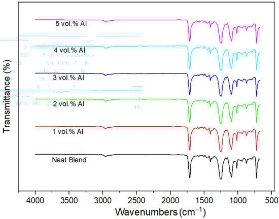 FTIR spectra of the Neat PBT–PET blend and its Al nanocomposites.