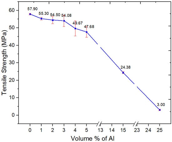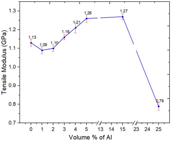 Young’s modulus, tensile strength, and strain-at-break of the Al nano-spherical composites are presented in Figure 7, Figure 8 and Figure 9, respectively. From Figure 7, the tensile modulus of the Al nano-spherical composites (1, 2, 3, 4 and 5 vol.%) increases with the addition of aluminum. In Figure 7, at 1 and 2 vol.%, the apparently slight reduction in the modulus is not statistically different from the unfilled blend. However, after 3% the modulus increases. At 25%, there is an apparently large drop, and this arises because major agglomeration prevents stress transfer even at low strains. Such a drop in modulus at 25% was not seen in our other work with Al nano platelets in 60/40 PBT–PET. In general, with nano fillers, if they are going to be effective, this will be seen below about 10%, and loadings above that are faced with problems of agglomeration.