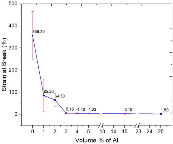 The addition of 3 vol.% of nano-spherical aluminum particles to the semi-crystalline PBT–PET blend decreased the elongation-at-break, with a drastic fall from 350% for the unfilled polymer to a few % (Figure 9). The decrease of the strain-at-break in Figure 9 is due to the immobilization of the polymer chains. In contrast, for nano-spherical Al in an amorphous PET matrix, we had surprisingly found the elongation increased from 96% in unfilled polymer to 428% with 3 vol.% of nano-spherical Al [15]. For this property, the matrix makes a difference (compared with Al in amorphous PET, the adhesion with the Al in PBT–PET is intinsically weaker due to the PBT and the PBT–PET matrix is crystalline).