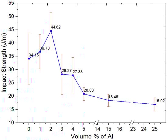 The impact resistance of Al nano-spherical composites increased with increasing nano Al content until it reached the highest value at 44.62 J/m for 2 vol.% and then started decreasing for any further increase in the nano-spherical Al loadings. The statistical paired t-test for the unfilled blend versus 2 vol.% showed that at the 0.05 level, the difference of the population means was significantly different. At 5 vol.%, the value decreased to 20.9 J/m.