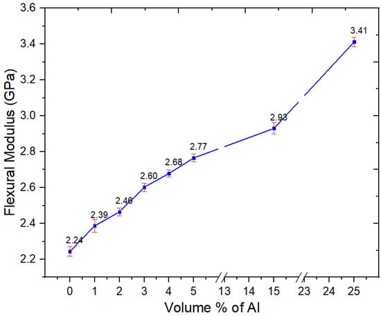 The flexural properties of Al nano-spherical composites are shown in Figure 11, Figure 12 and Figure 13. From Figure 11, the flexural modulus increased with increasing Al content. However, unlike with Al flakes (nano platelets), there was no orientation effect, and a very high flexural modulus, similar to the 8 GPa seen with flakes [16], was not obtained even at 25 vol.%; the flexural modulus at 25 vol.% of nano-spherical Al was 3.41 GPa.