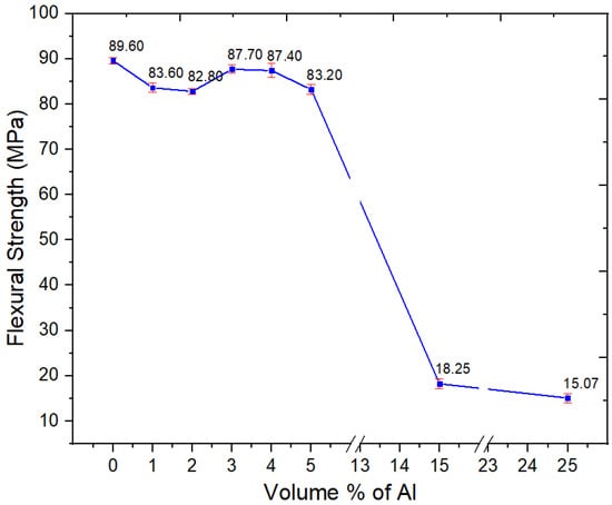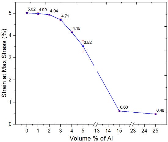 There was a minor decrease in the flexural strength for Al nano-spherical composites at lower loadings as in Figure 12. At up to 5 vol.% Al, there was a significant drop of flexural strength. However, at 15 and 25 vol.%, there were precipitous drops in the flexural strength to 18.3 and 15.1 MPa, respectively. This is as seen with the other mechanical properties such as tensile strength. At these loadings of the nano-spherical Al, the composite becomes both weak and brittle to the point where it is not usable. From Figure 13, the strain at maximum stress values decreased with increasing volume fraction of spherical Al in the composite.