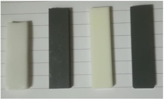 Table 3 shows the % shrinkage for Al platelet composites and nano-spherical Al polyester composites when as-molded bars were held at 150 °C for 30 min. Molded bars with a uniform length of 50 mm were used and the effect can be seen in Figure 14. Amorphous PET bar is also included in the comparison. The starting PET bar was in an amorphous state, and hence showed the highest shrinkage and warping due to cold crystallization occurring as the temperature crossed its Tg (78 °C). On crystallization, the density of the amorphous PET bar changed from 1.333 g/cm3 to 1.39 g/cm3 and the originally transparent bar became white (leftmost bar in Figure 14) This magnitude of shrinkage is easily visible as the PET bar became shorter than the rest in Figure 14. However, filling the amorphous PET with Al reduced the shrinkage substantially, when heated above the Tg. Fillers regardless of shape increase dimensional stability.