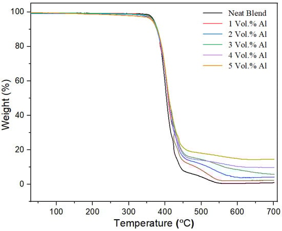 Figure 15 shows the TGA results for all of the nano-spherical Al composites compared with the 60/40 PBT–PET matrix under argon atmosphere. The results demonstrate no major weight loss up to 355 °C for all Al–PBT–PET composites.