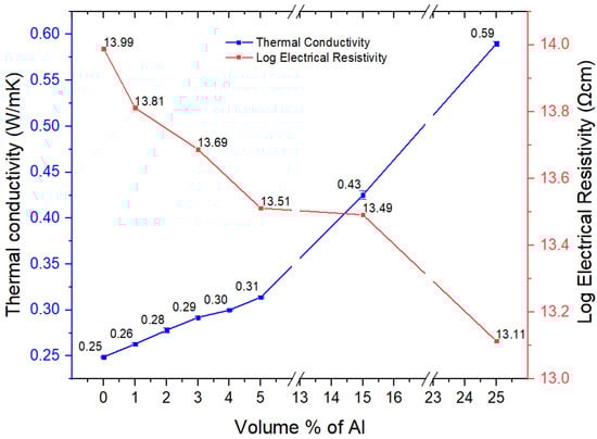 Studies on aluminum-particle-filled polymers, such as polypropylene (PP) [8], unsaturated polyester resin [9], commercial epoxide resin (PL-411) [10], high density polyethylene (HDPE) [11,12,13] and polyvinyl chloride [14] have been reported. Generally, the earlier studies used micron-sized Al powders, and while electrical conductivity is obtained at loadings of 30–40 vol.%, there is usually a drop in impact resistance, strength, and elongation-to-break. The latter is most often the case with filler composites. However, contrary to this general trend, a recent study by Anis et al. [15] on the aluminum-filled amorphous PET with irregular micron-shaped Al particles led to a simultaneous increase in the impact resistance, strength and modulus (normally with particle composites with high modulus fillers, the modulus increases, while strength, elongation and toughness decrease with filler content). However, an upshoot in electrical conductivity was not reached even at the highest volume percentage of 25%. In another work, Alhamidi et al. [16] used Al flakes in a PBT–PET blend and showed enhanced conductivity [16]. Electrical conductivity levels of the static-dissipation range were obtained with the Al platelets in the PBT–PET blend, compared with the same in a pure PET.