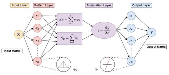 The concept of the GRNN is based on the theory of nonlinear regression analysis [27], and its structure consists of four neuron layers, input, pattern (radial basis), summation, and output (linear) layer, as shown schematically in Figure 1 [13]. (The software implementation of the GRNN general topological structure can be found in our previous work [7].)