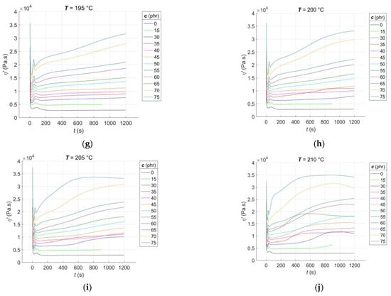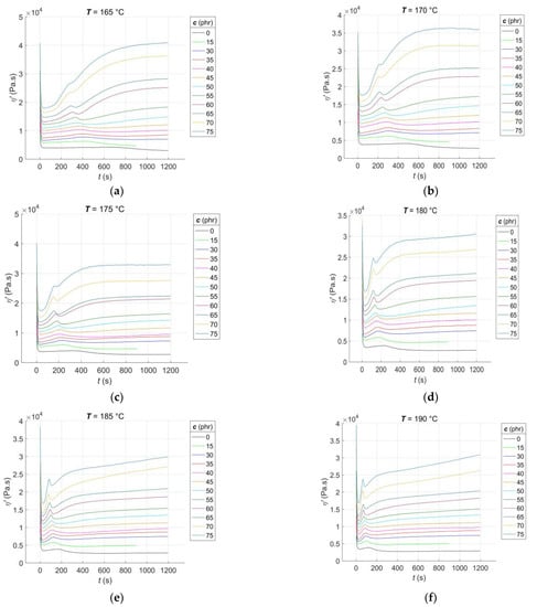 The RDV–time curves η’(c, T, t) for the RBs with CB filler contents of c = [0, 15, 30:5:75] phr, vulcanised at constant cure temperatures of T = [165:5:210] °C, are presented in Figure 2.