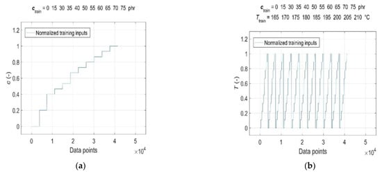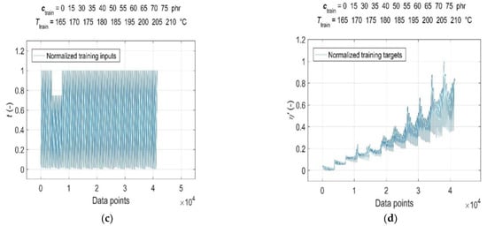 Normalised training inputs for: (a) CB contents ctrain = [0, 15, 30:5:40 50:5:75] phr in RB; (b) cure temperatures Ttrain = [165:5:185, 195:5:210] °C; (c) curing time ttrain and (d) normalised training targets η’(ctrain, Ttrain, ttrain).