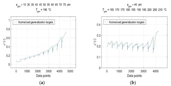 Normalised generalisation targets η’(cgen, Tgen, tgen) for: (a) CB contents cgen = [15, 30:5:75] phr in RB at cure temperature Tgen = 190 °C and (b) cure temperatures Tgen = [165:5:210] °C at CB contents cgen = 45 phr in RB.