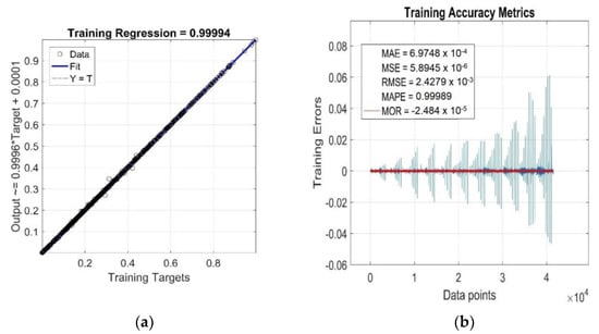 From the above analysis of training accuracy metrics, it can be concluded that the fitting performance of the GRNN model (12) on the training data is very satisfactory, with a mean of residuals MOR ≅ −2.48 × 10−5 (red line) and mean absolute percentage error MAPE less than the required 1% (Figure 5b).