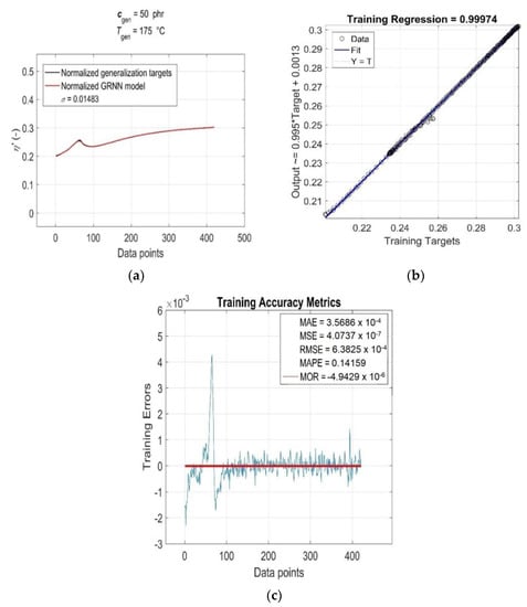The results of the goodness-of-fit model evaluation to the training data are shown in Figure 5a,b. Since the GRNN model was optimised in the process of global network training off all the training data, all the observed accuracy metrics presented in these figures were calculated for the entire training dataset, not for the individual RDV–time curves η’(ctrain, Ttrain, ttrain) of the investigated RB with different CB contents ctrain at different cure temperatures Ttrain.