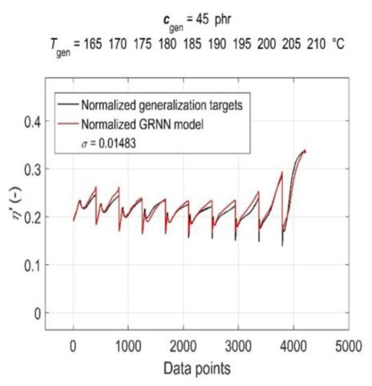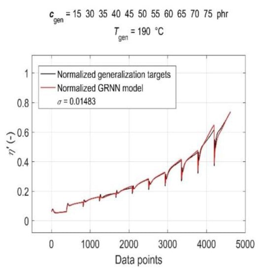 The evaluation of the generalisation capability and forecasting accuracy of the developed GRNN model was performed on two normalised generalisation datasets corresponding to all CB contents, except cgen = 0 phr, at a cure temperature of 190 °C, and to all cure temperatures at cgen = 45 phr of CB contents in RB, which were not included in the training data.