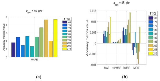 Since, for rubber practice, it is essential to know the prediction accuracy for each single predicted RDV–time curve, the statistical accuracy metrics (14)–(20) were computed with generalisation data simulated individually for each pair of Tgen/cgen and cgen/Tgen. The values of the observed accuracy metrics, divided into two groups based on their corresponding magnitudes, are presented in the bar charts shown in Figure 9 and Figure 10.