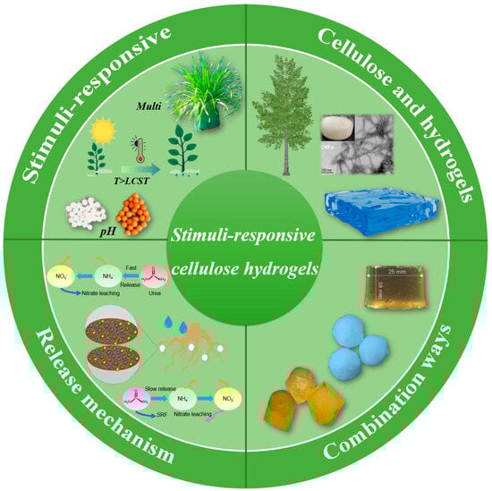 Nowadays, the green, biodegradable and renewable polymers (e.g., cellulose [11], lignin [12], starch [13], chitosan [14], etc.) have been used to prepare SRF under the “carbon peaking and carbon neutrality” strategy. They greatly reduce the production costs, simplify the manufacturing process, and solve the environmental problems caused by excess by-products. Some factors should be considered during the design procedure as follows: (a) to load sufficient nutrients; (b) the safety, efficiency and biodegradability of designed material; (c) no interference towards vegetation germination [15]; and (d) to release the fertilizer according to the stimulation of plant growth stages [3]. As a polymeric compound widely found in plant cell walls, cellulose has been considered as the most abundant and renewable material on earth [16]. It contains abundant functional groups, exceptional mechanical properties and high chemical modifiability. Moreover, cellulose could be produced into fibrous forms at the micro/nanometer size scale, which becomes a promising candidate for the fabrication of hydrogels in recent years [17,18,19,20,21]. Cellulose-based hydrogels can be prepared by physically crosslinking the cellulose molecules, or by chemically and/or physically crosslinking the cellulose derivatives [22]. The attractive properties of cellulose and its derivatives (e.g., ethylcellulose, cellulose acetate, methylcellulose, etc.) contain properties of biodegradability, biocompatibility, nontoxicity and functionality, which have motivated scientists and researchers worldwide to develop the cellulose hydrogels for a variety of applications. Notably, cellulose also improves the mechanical strength and biodegradability of the composite hydrogel product, which has high potential as an agricultural-grade reinforcing material in the manufacture of environmentally friendly stimulus-responsive hydrogel, indicating its promising application in SRF [23].