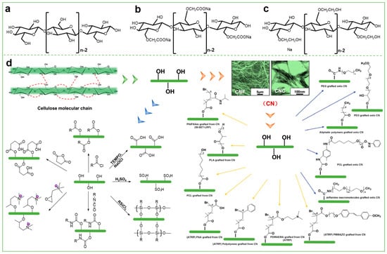 Chemical structures of (a) cellulose, (b) carboxymethyl cellulose (CMC), and (c) hydroxyethyl cellulose (HEC). (d) Schematic illustration of modification and functionalization of cellulose and its derivatives.