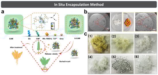 The in situ encapsulation method (Figure 5) involves directly mixing the fertilizer and raw materials together. During the formation of hydrogel, the fertilizer can be encapsulated in the hydrogel matrix [65]. Wang et al. [15] prepared the CNF from pulp residue, which was further mixed with SA and urea in the presence MIL-100 (Fe) under stirring condition. Then, the ball-shaped CNF/SA/MOFs hydrogel (CAM) with good water- and fertilizer-regulating functions was prepared successfully by dropping the above mixture uniformly in CaCl2 solution (200 mL, 2.5 wt%) by using a syringe (Figure 5a,b).