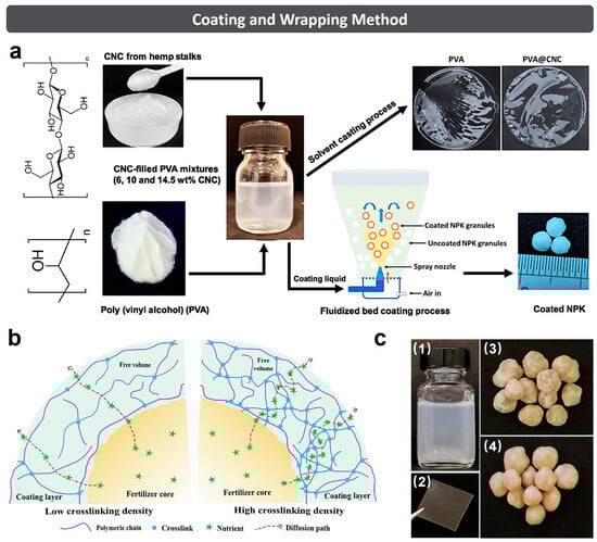 Kassem et al. [88] reported a waterborne and biodegradable PVA@CNC nanocomposite hydrogel formulation, which was further applied on the surface of NPK fertilizer granules to form the microlayer in the Wurster chamber of a fluidized bed dryer (Figure 6a). It was found that such a coating layer extended the NPK nutrients’ release time from 3 days for uncoated fertilizer to 30 days for PVA@CNC-coated fertilizer in soil medium. Furthermore, the crushing strength of fertilizer was increased after PVA@CNC coating. The improved water-retention capacity of the soil amended with PVA@CNC-coated NPK fertilizer demonstrated the intrinsic water-saving property of PVA@CNC. Apparently, the facile coating method indeed brings physical and chemical advantages to the conventional fertilizer in terms of structural stability, nutrient release and water management.