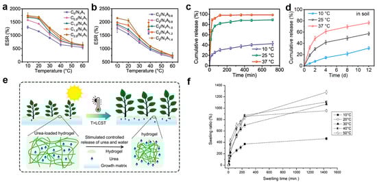 Shang et al. [85] developed the temperature-responsive hydrogels by N-vinylcaprolactam (NVCL) aqueous dispersion through the emulsification of CMC and acrylamide (AM). Additionally, urea was loaded as a fertilizer into the hydrogels (Figure 9a–e). As the hydrophilic groups increase, the solubility of hydrogel at 20 °C can reach 2056% (Figure 9a,b). All hydrogels display a common pattern: elevated ESR at low temperature and reduced ESR at high temperature. The trend can be explained by the presence of temperature-sensitive PNVCL in hydrogel, which exhibits an extended state when the ambient temperature is below the LCST. When the hydrogel was heated above the LCST (25 °C), its PNVCL segment will undergo curling. This transition predominantly exposes the hydrophobic groups, and promotes the increasing hydrogen bonding within the polymer segments, hindering the transport of water molecules and resulting in the reduced ESR. In Figure 9c, the cumulative fertilizer release of the product below the LCST (over 12 h) reaches 80%. At temperatures of 37 °C, the hydrogel exhibited a more pronounced release behavior, reaching a cumulative release up to 98% within the initial 6 h (Figure 9c). A similar behavior was observed in the soil (Figure 9d). This proves that the urea release of hydrogel was effectively controlled through the temperature stimulation (Figure 9e).