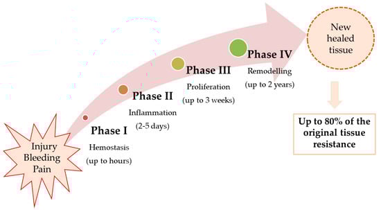 Immediately after injury, a cascade of physiological reactions is triggered in order to restore the physical and functional integrity of the affected area []. Wound healing involves four steps: hemostasis, inflammation, proliferation, and remodeling (Figure 1).