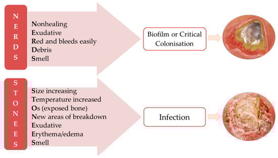 Two mnemonics are recommended for infected chronic wound identification NERDS, with 73% sensitivity and 80.5% specificity when three criteria are met, and STONEES, which has 90% sensitivity and 69.4% specificity when at least three signs are observed (Figure 3). When NERDS criteria are met, biofilm is present or the wound is critically colonized. If the STONEES are observed, then the chronic wound is infected [,].