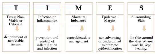 To support the medical healthcare professionals, the TIMES acronym was implemented two decades ago, and it is still used (Figure 4). It standardizes the indicators used in wound evaluation and gives information to establish a treatment plan [].