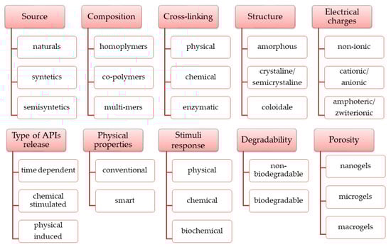 Over time, extensive research has led to numerous types of hydrogels with varied physico-chemical properties according to several criteria. The main categories of hydrogels (Figure 5) were established according to the raw materials sources and polymeric composition, physico-chemical properties, release conditions of the APIs embedded in the 3D matrix, and other properties [,,,].