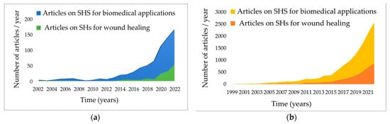 According to PubMed and Science Direct databases, in the last two decades, the amount of research on smart materials for biomedical fields has increased year by year, summing up to 8500 reviews and original articles in 2022, including more than 3600 on smart hydrogels (SHs) dedicated to wound care management (Figure 6).