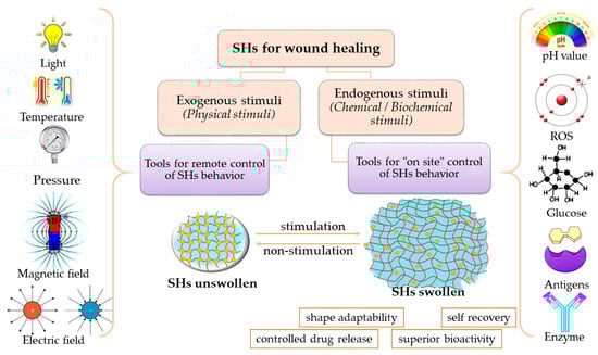 The target of multifunctional SHs in wound care is to overcome the drawbacks of traditional hydrogels and to improve their therapeutic performance using the ability to reversibly modify their 3D structure in response to one or more external stimuli []. The comparative characteristics of traditional hydrogels versus SHs relevant for manufacturing and performance of wound care products are summarized in the Table 1