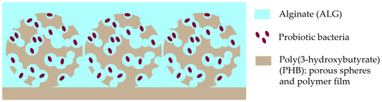 The final step of the design was to place a porous substrate with PHB microspheres in a 1% ALG solution. The 1% ALG solution itself was in four variants: ALG, ALG with an encapsulation of bacterial strain Lactobacillus fermentum 90 TS-4 (L), ALG with an encapsulation of bacterial strain Bifidobacterium longum MC-42 (B), and ALG with a co-encapsulation of bacterial strains Lactobacillus fermentum 90 TS-4 and Bifidobacterium longum MC-42 (LB); a visual design scheme of the developed composite PHB/ALG scaffolds is presented in Figure 1. Cultivation of probiotic bacteria is described in Supplementary Materials.
