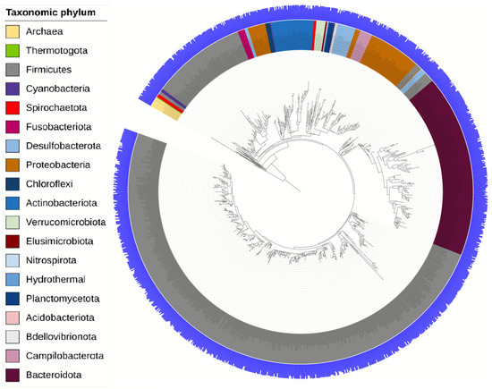 The taxonomy of the phylogenetic tree was presented with a resolution down to the bacterial phylum (Figure 4). From the data obtained, a total of 19 phyla were identified. The dominant phylum in the gut microbiota of the studied Wistar rats was Firmicutes, which is fully consistent with the literature data [30,31].