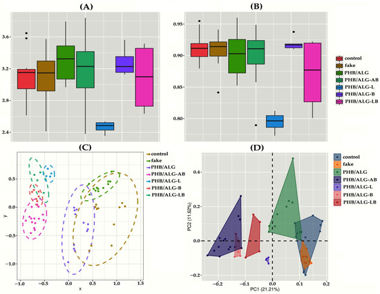 Analysis of alpha diversity metrics by Shannon and Simpson indices showed low diversity of gut microbiota in rats with an implanted PHB/ALG scaffold and with ALG spheres of encapsulated Lactobacillus (PHB/ALG-L) (Figure 5A,B). Presumably, Lactobacillus-based spheres promoted aggressive growth of one single or several taxonomic groups, replacing many other microorganisms of the large intestine. It is possible that the metabolic products of the encapsulated bacteria gave a dramatic boost to the growth of a few taxonomic groups of bacteria. The so-called “cross-feeding” effect stimulates the growth of some microbes at the expense of metabolites from another bacterial group and sharply suppresses the growth of other bacterial groups [32]. It should be noted that the level of alpha diversity (except for PHB/ALG-L) was not reduced in different groups of rats compared to the control group (Figure 5A,B). This observation emphasizes that it is not always the case that a change in conditions, such as surgical intervention or artificial conditions, reduces the level of bacterial communities in the mammalian gut microbiota [33].