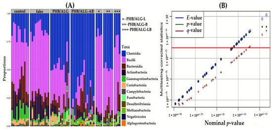 Microbial abundance analyses based on 16S rRNA gene sequence. (A)—Class-level abundance of bacterial communities of the gut microbiota of the studied rats. (B)—Non-parametric method of multiple comparisons using the Kruskal–Wallis test. Statistical significance of individual OTUs was determined by E-value, p-value, and q-value.
