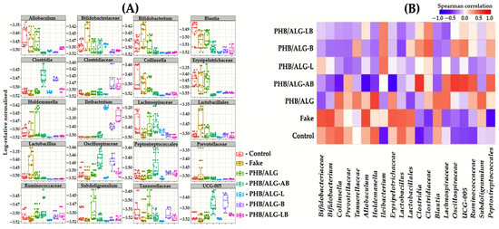 The composition of the intestinal microbiota of the studied rats, including only statistically significant OTUs, showed that fecal samples collected from rats with the implanted construct and probiotic bacteria included (PHB/ALG-L, PHB/ALG-B, and PHB/ALG-LB) showed a predominance of bacteria of the genus Ileibacterium sp. (Figure 7A). Data on this genus are rather scarce in the literature; bacteria of this taxonomic group are primarily known for being responsible for the metabolism of mono- and disaccharides in a wide range with their degradation to acetates [44]. It is likely that this microbe is responsible for the low alpha diversity in the group of rat samples with ALG sphere-encapsulated Lactobacillus sp. As previously suggested in the alpha diversity results, Ileibactreium sp. Through cross-feeding utilized metabolites of encapsulated Lactobacillus as a substrate for active growth and division, thereby inhibiting the growth and division of other bacteria in the gut community [32]. The probiotic bacteria Lactobacillus sp. And Bifidobacterium sp. Have an increased representation in the group where rats underwent false surgeries (fake group). According to literature data, it is known that due to their symbiotic relationship with the host organism, probiotics actively promote healing of the GI tract, have anti-inflammatory effects, and improve intestinal peristalsis [45,46,47,48].