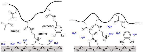 - Degen, G.D.; Stow, P.R.; Lewis, R.B.; Andresen Eguiluz, R.C.; Valois, E.; Kristiansen, K.; Butler, A.; Israelachvili, J.N. Impact of Molecular Architecture and Adsorption Density on Adhesion of Mussel-Inspired Surface Primers with Catechol-Cation Synergy. J. Am. Chem. Soc. 2019, 141, 18673–18681. [Google Scholar] [CrossRef]