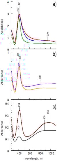 UV-Vis-NIR spectra of diluted suspensions. From top to bottom: (a) PP@AgNPs-1 (blue line), PP@AgNPs-2 (red line) and PP@AgNPs-3 (green line); (b) PP@AgNPs-4 (purple line) and PP@AgNPs-5 (orange line); (c) PP@AgNPs-6 (gray line) and PP@AgNPs-7 (brown line).